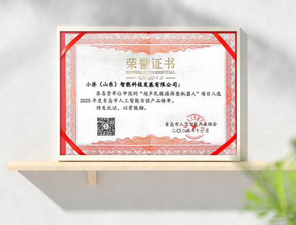喜讯 | 小济智能“超声乳腺癌筛查机器人”入选2025年度青岛市人工智能百强产品榜单近日,青岛市人工智能产业协会正式公布了“2025年度青岛市人工智能百强产品”表彰名单。 经过专家评审与层层筛选,小济(山东)智能科技发展有限公司申报的“超声乳腺癌筛查机器人”项目,凭借在智能机器人与医疗健康领域的创新应用与技术实力成功入选。