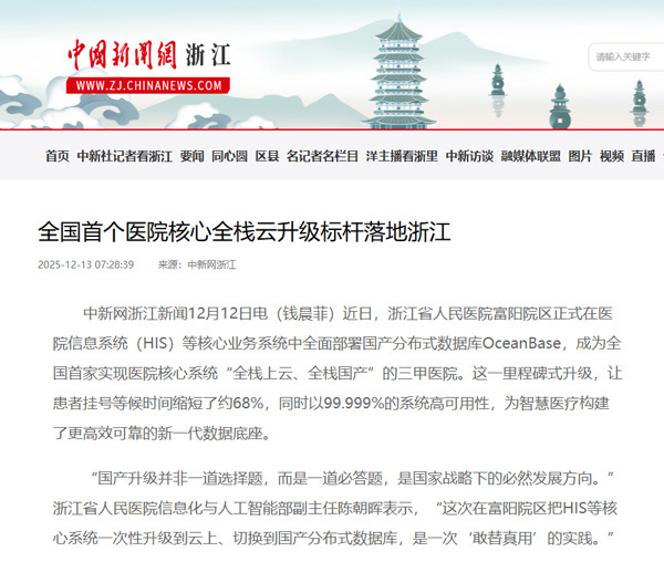 浙江省人民医院富阳院区在完成“全栈国产、全栈上云”升级后,患者全流程等候时间缩短约 68%,核心集群故障恢复压缩至 8 秒。