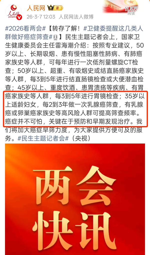 据 人民网 报道,在民生主题记者会上,国家卫健委相关负责人表示: 35岁以上适龄女性建议每2–3年进行一次乳腺癌筛查。 对于有乳腺癌或卵巢癌家族史的高风险人群,应适当提高筛查频率。